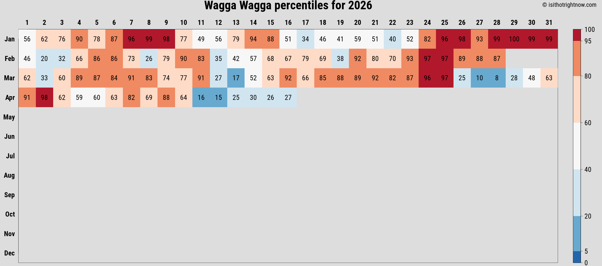 We’ve compared every day this year at Wagga Wagga to similar times of year in the past. Red days were hot compared to records; blue days were cold.